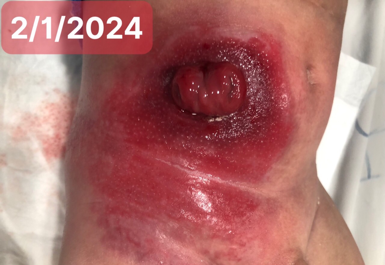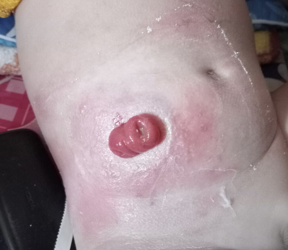 Đây là bé 6 tháng tuổi, có hậu môn nhân tạo hồi tràng, chất thải lỏng ra liên tục. Bé được người nhà dùng tả cắt ra để làm miếng lót hút chất thải dẫn đến tình trạng vùng da xung quanh hậu môn nhân tạo loét nặng. Bé đau và khóc nhiều hơn khi bà và mẹ chăm sóc vùng da xung quanh hậu môn nhân tạo, bé sụt cân, bú ít hơn và thậm chí bỏ bú. Bà và mẹ cũng không thể ngủ yên khi phải thay miếng lót liên tục cho bé.
